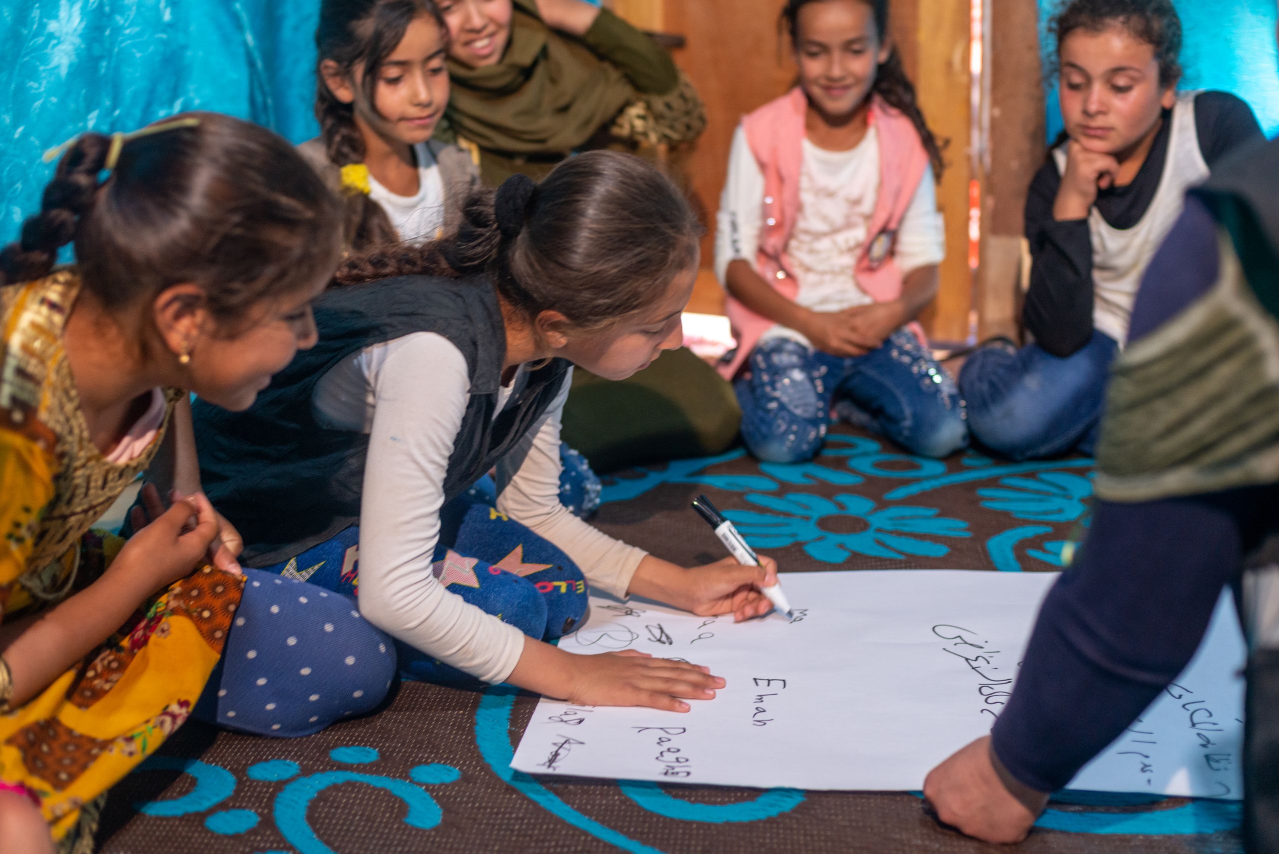 Before they start, the girls write their rules for the session on a large sheet of paper. They agree to respect, not judge or interrupt each other. Each of them signs their name on the sheet and Nahla tapes it to the wall of the tent.
