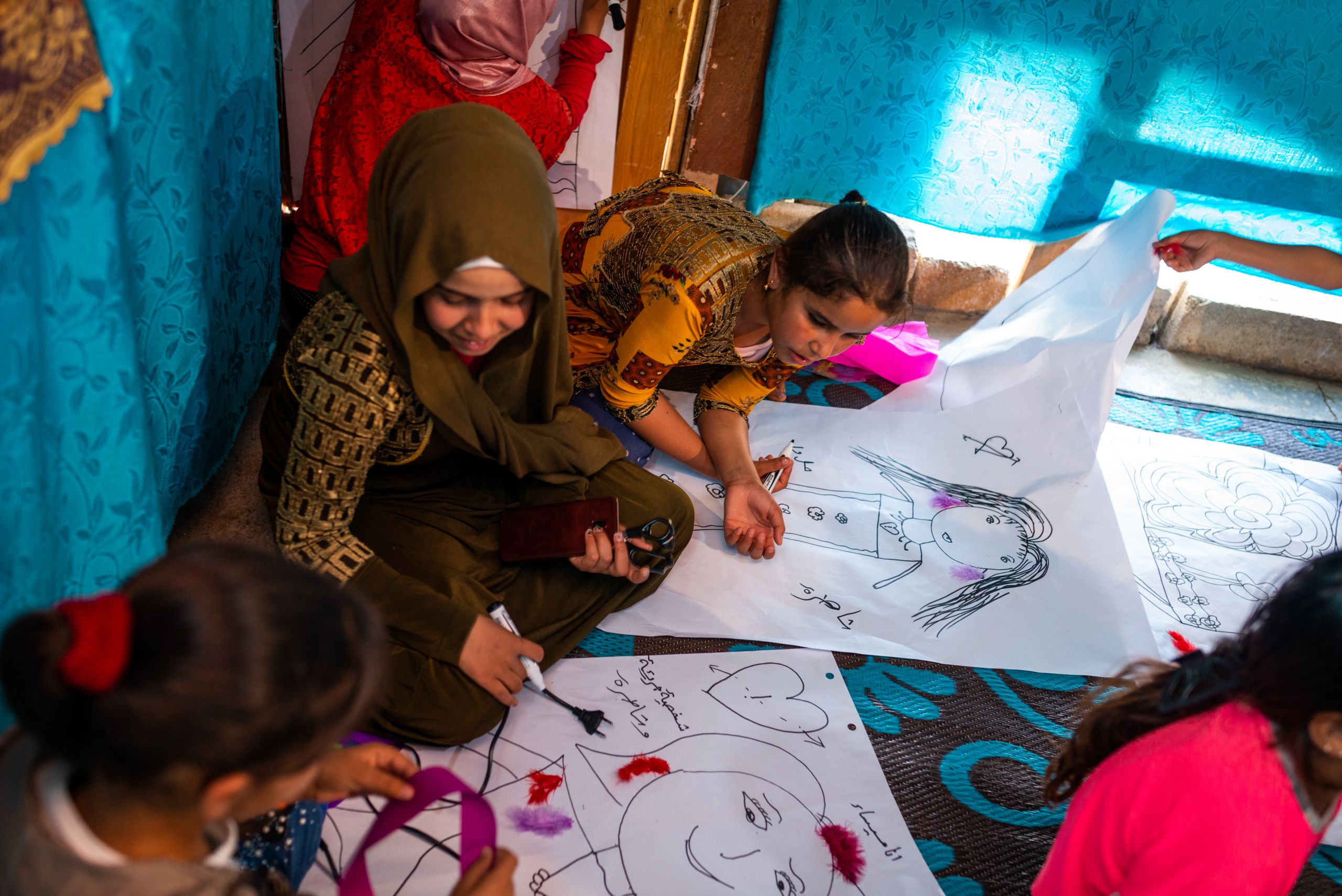 As the group sit down along the walls of the tent, their workshop leader Nahla sorts through pens, paper and art materials, making sure everything is ready.